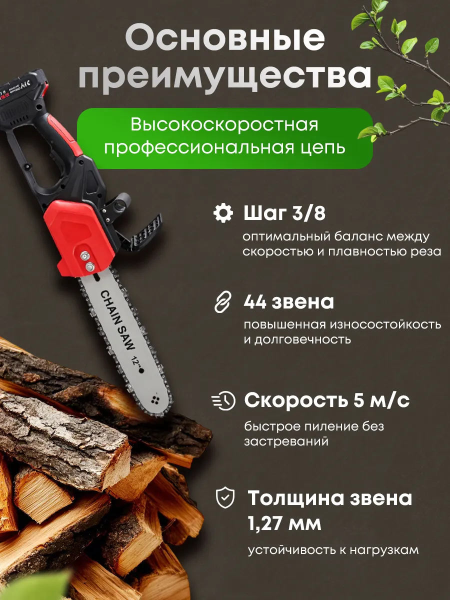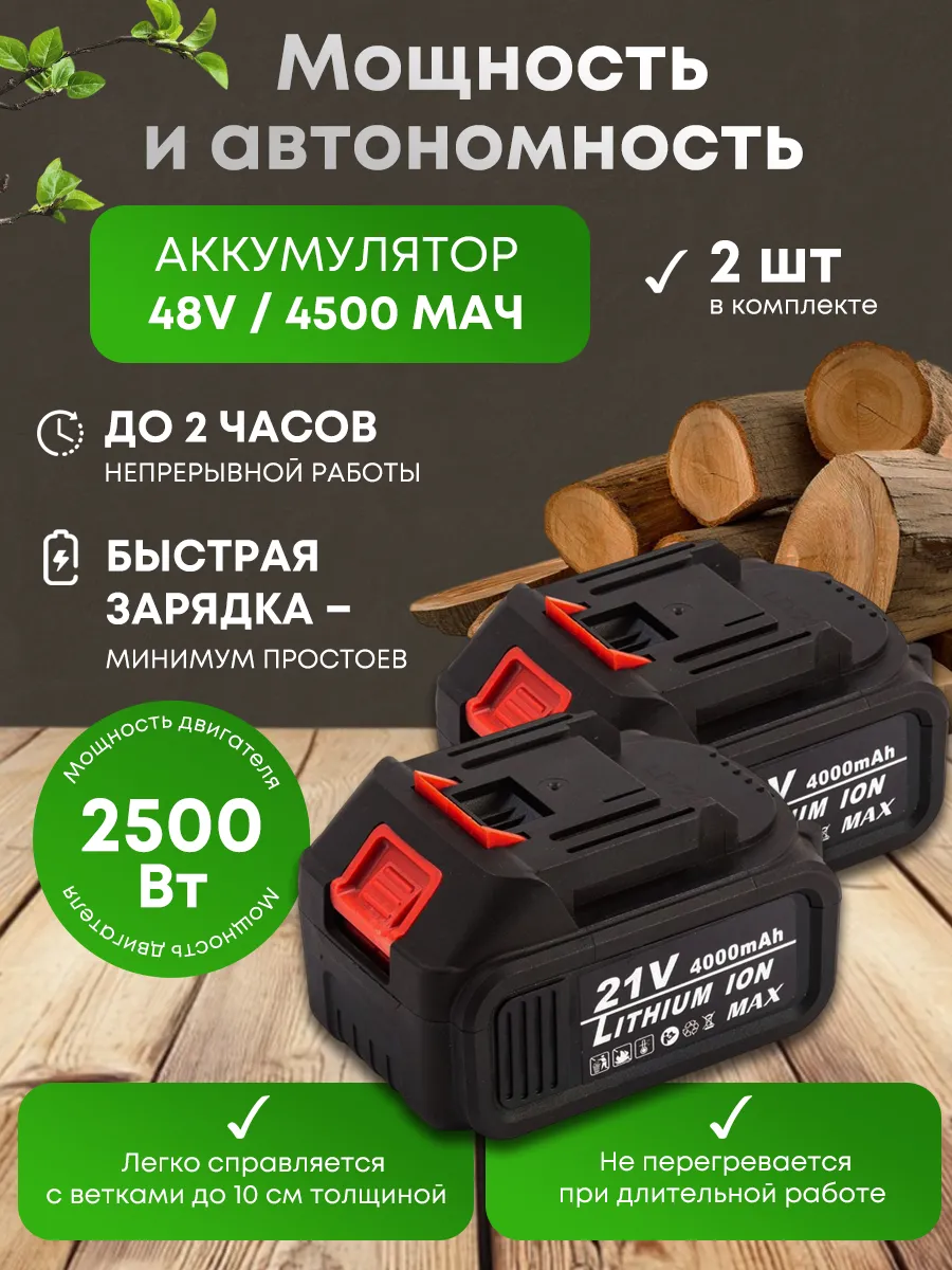 Электродвигатель с питанием от мощного аккумулятора на 48 Вольт позволяет долго работать без подзарядки. Длина шины составляет 12 дюймов и высокоэффективная цепь с шагом 3/8" и толщиной звена 1,27 мм , что обеспечивает отличную производительность. Дополнительно поставляются два аккумулятора увеличенной емкости, гарантирующие длительную непрерывную работу. Разборная конструкция облегчает хранение и транспортировку инструмента.